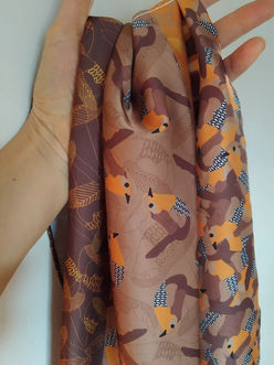 El elemento rector del diseño es el Chucao (ave que habita nuestra cordillera) El concepto de los diseños de las estampas es la posibilidad de habitar otras realidades (como estar en la piel de otro, en las plumas de otro…) Por un lado se representa al pájaro a través de la textura de sus plumas y por otro, se crea una trama que sugiere su desmaterialización y así entonces, es posible habitar el interior de sus plumas. Soporte: seda sintética. Medida: 103 x 47 cm. Tipo de estampado: sublimación. Terminación artesanal: costura roulotte.