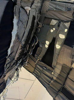 Elementos y materiales: Retazos de denim y prendas de jean en desuso (pantalones, camperas, faldas). Hilos de algodón y poliéster para patchwork. Base de lona reciclada como soporte estructural. Técnica: Patchwork y ensamblado manual con costuras visibles. Formato: Lona flexible de gran formato, puede instalarse como superficie, pared o estructura suspendida.